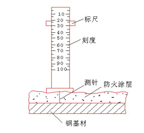 三、測試時,將測厚探針垂直插入防火涂層直到鋼基材表面上,記錄標尺讀數