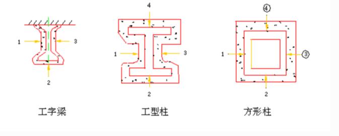 全鋼框架結構的梁和柱的防火涂層厚度測定,在構件長度內每隔3m取一截面,按附圖4.2所示位置測試。